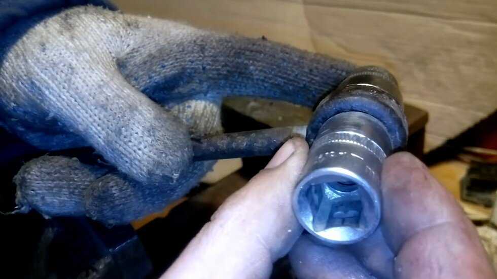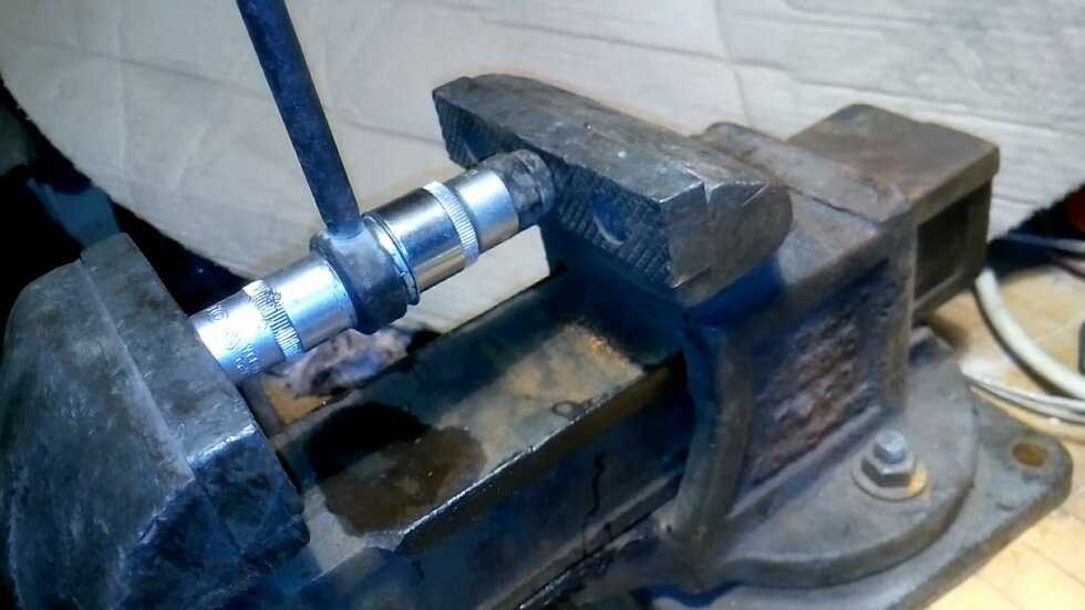 Далее для восстановления нужно подобрать головки (оправку), собрав с них конструкцию и хорошо обжать по кольцу заднюю часть детали (там где металл прижимает втулку).