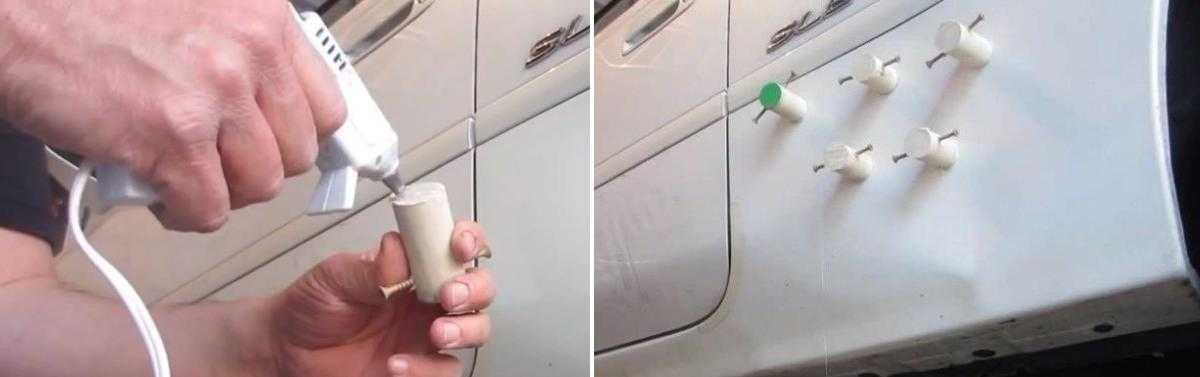 - Смысл в том, чтобы приклеить к вмятине вытягивающие элементы в нескольких местах. Потянув за них, можно выправить вмятину. Подомный метод используется в клеевой системе технологии PDR.
