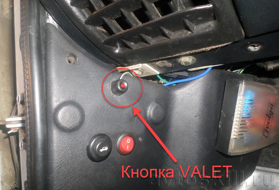 Если блок не откликается на сигнал брелока, то сброс можно сделать используя кнопку valet. Устанавливают ее обычно под левым коленом водителя, но также может быть другое расположение.
