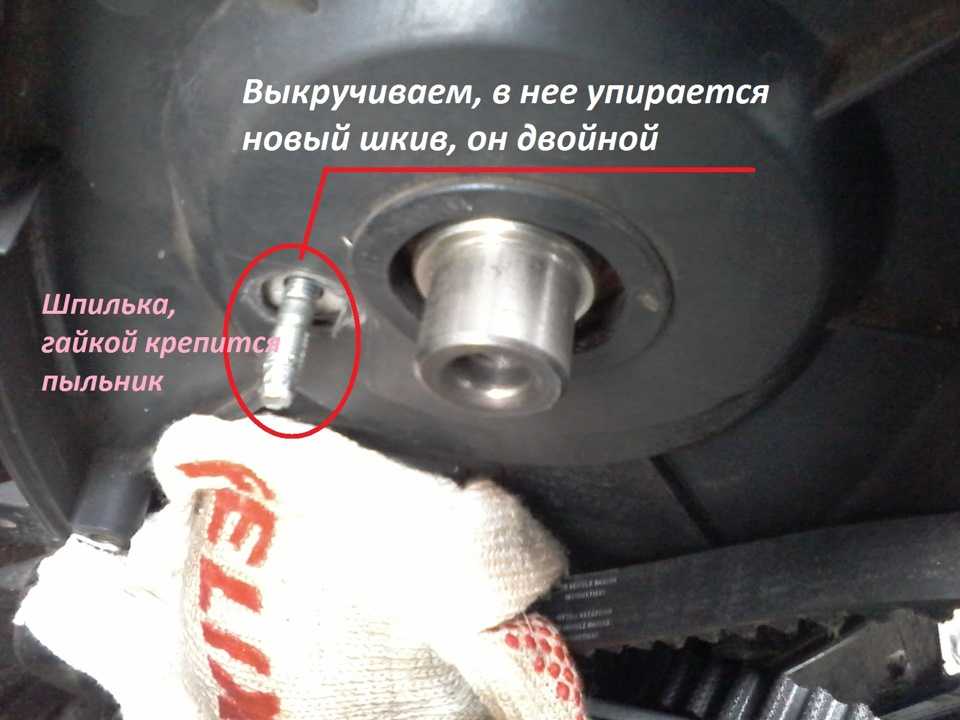 По шпонке РВ. Многие мучаются, когда одевают шкив. Мажем шпонку герметиком и приклеиваем к РВ, все можно спокойно одевать шкив!